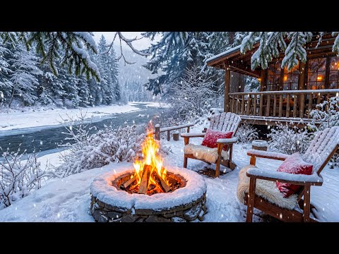 Winter Cabin by the Riverside in the Snowy Forest ❄️🔥 Crackling Campfire, Snowfall & Nature Sounds