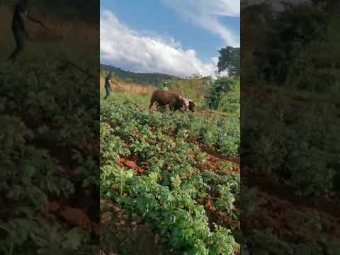 Ridging potatoes with Ox-drawn plough