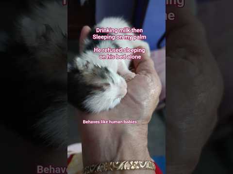Kitten sleeping on my palm after drinking milk 🍼 refused to sleep on his own bed ,like human baby
