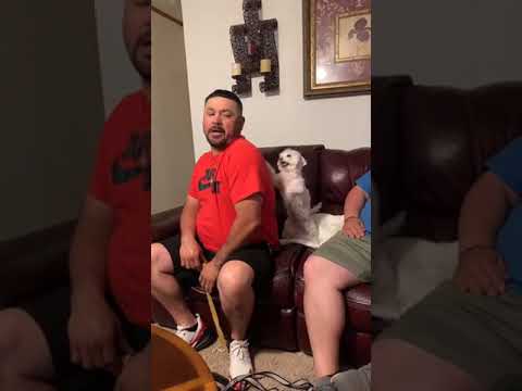 Boxer dog so happy to see his daddy , loves his back scratch