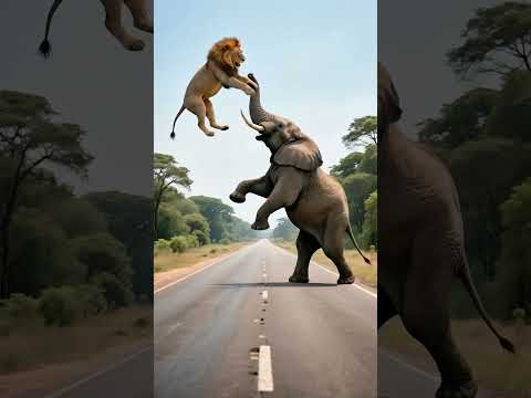 The elephant frantically threw the lion to save the baby elephant.