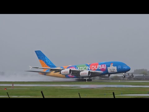 STORM AMY CLOSING IN AS EMIRATES AIRBUS A380 A6-EEU HAS EXTREME WET DEPARTURE FROM GLA #aviation