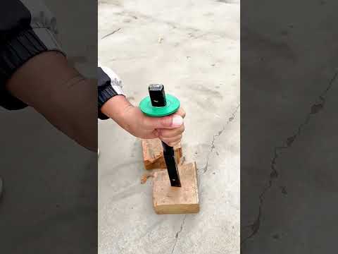 Testing the durability of a steel chisel by striking it against solid bricks on a concrete surface