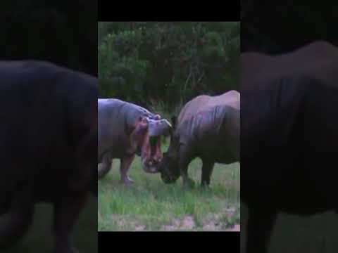 The hippo tries to scare the rhino but!! #animals #wildlife #trending #hippo #rhino #shorts