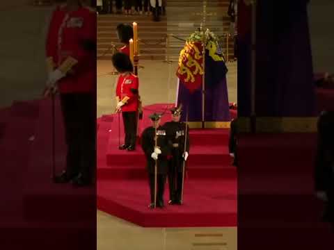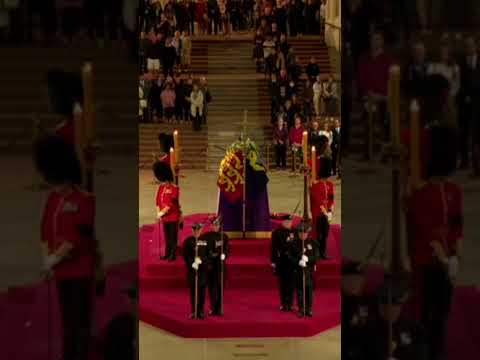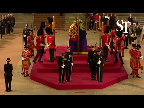 Royal guard falls off the Queen’s coffin podium on first night of Lying in State