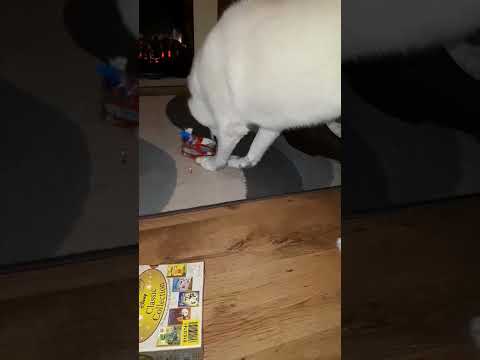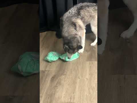 Husky struggling to open her birthday gift.