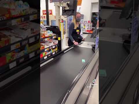 Cashier is waiting on tictacs to go all the way down the conveyor belt.