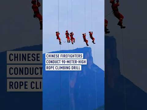 Chinese firefighters conduct 90-meter-high rope climbing drill