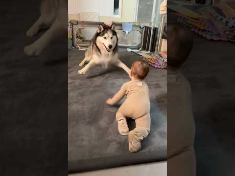 Husky thinks Baby is Puppy, Wants to Play