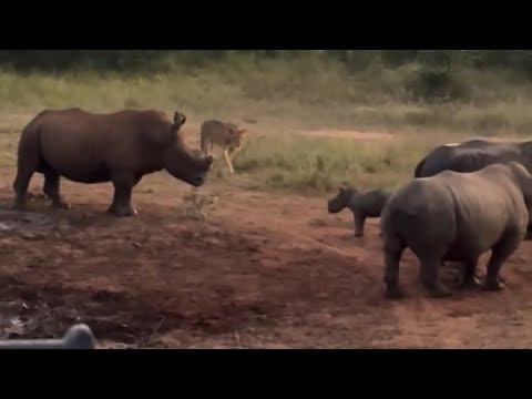 Protective Rhino Mother Stops a Lion From Attacking Her Baby