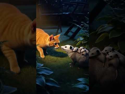 Curious Cat Meets Opossum Mom and Her Babies at Night #shorts #animals #cat #opossum