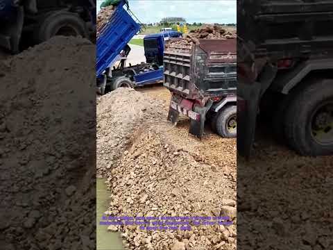 15T Trucks Unloading Big Stone Fall on the Dozer D37E, Mountain Landfill LiuGong Dozer Leveling
