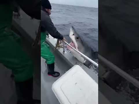 3 Heart Stopping Seconds Great White Shark JUMPS ONTO FISHING BOAT!