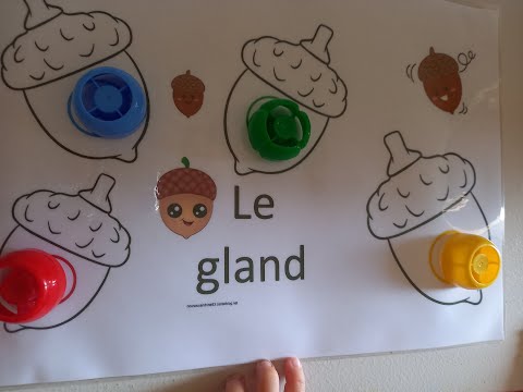 le gland d'automne et l'apprentissage des couleurs avec des bouchons de compote