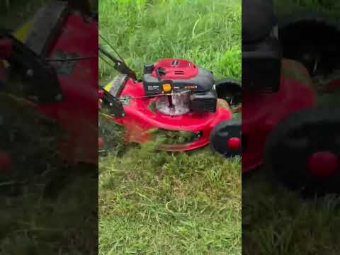Operating gas powered lawn mowers to cut tall grass and maintain outdoor garden landscapes