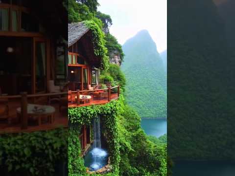 Cliff side Cabin with Lush Greenery, Cozy Balcony, Waterfall / Serene Lake / Mountain/ #shorts