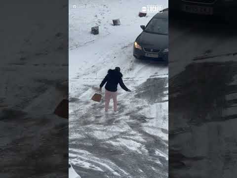 Woman hilariously slips on icy road