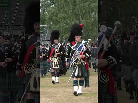 Massed Pipes and Drums salute the Chieftain during 2023 Dufftown Highland Games in Scotland #shorts