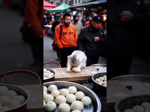 Hard-working Cat sells steamed bun. #cat #cats #catshorts #catvideo #catlover #funnycats #cutecat