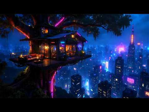 Lofi Ambient - Cozy Neon Treehouse in the Rain Above a Cyberpunk City | For Sleep & Study | 4K
