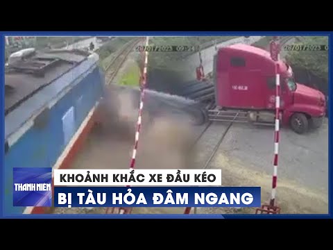 Khoảnh khắc xe đầu kéo bị tàu hỏa đâm trên đường sắt ở Hà Nội
