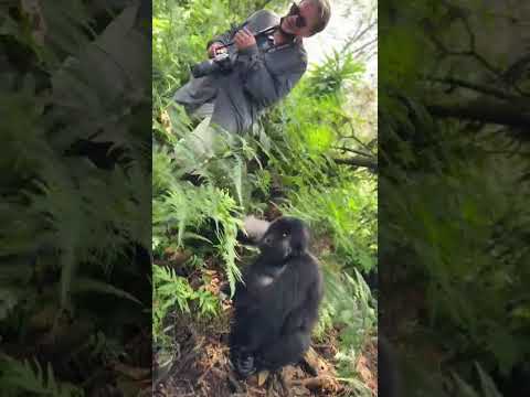 Gorilla trekking in Rwanda: tourist chats with a gorilla. #wildlife #nature #gorilla