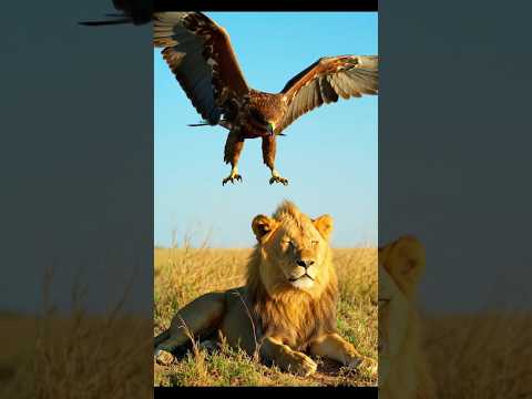 An eagle tries to hunt a lion.