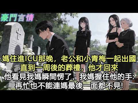 媽住進ICU那晚,老公和小青梅一起出國。我打電話要醫藥費,被青梅阻攔。直到一周後的葬禮,他才回來。他看見我媽站在我身旁,睜大了眼。我媽一把握住他的手:再忙也不能連媽最後一面都不見#小說 #愛情 #故事