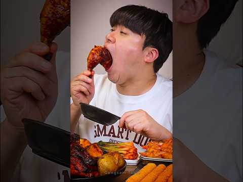 EATING SPICY BLACK BEAN NOODLES WITH FRIED EGG & WHOLE BBQ CHICKEN #shorts #mukbang #bbqchicken