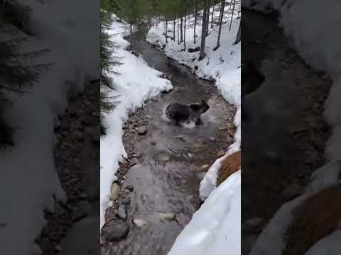 Bear Falls Down Slope Into Creek After Losing Balance Chasing a Deer