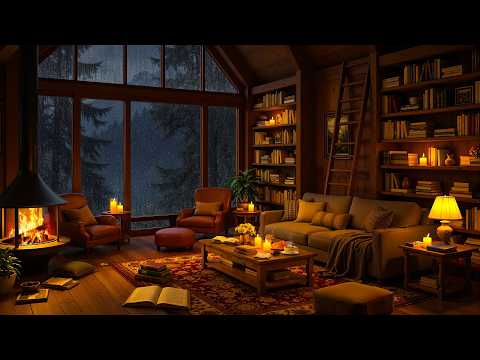 Cozy Reading Nook Ambience 🛖 Soft Jazz with Crackling Fireplace and Rain Sounds For Sleeping
