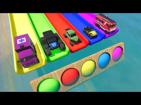 New Cars vs Deep Water & Slide with Portal Trap - Fire Truck Rescue Car - BeamNG #2