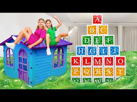 Les enfants apprennent l'alphabet et construisent une cabane avec des balles colorées