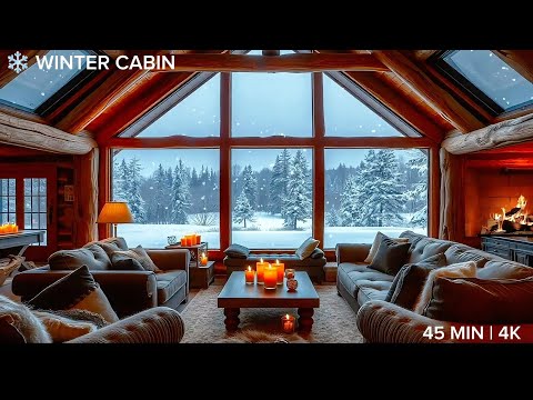 45 Min Cozy Winter Cabin with Fireplace & Snowfall 4K - Crackling Fire Sounds for Relaxation & Sleep