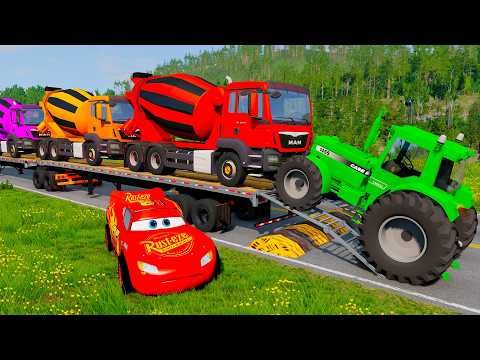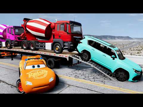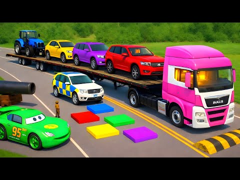 Double Flatbed Truck McQueen / Transportation with Truck / Pothole vs 14Car 64 / Mao Drive BeamNG