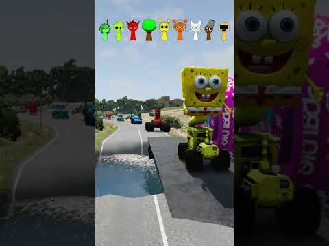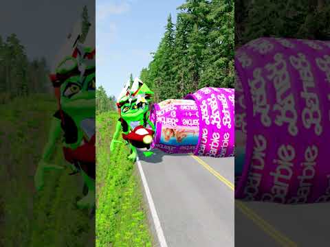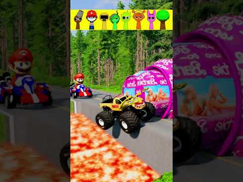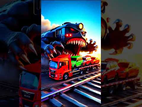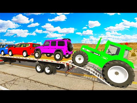 Four Trucks Transporting cars with Flatbed Trailers | Cars vs Speedbump vs Train vs Pothole #000