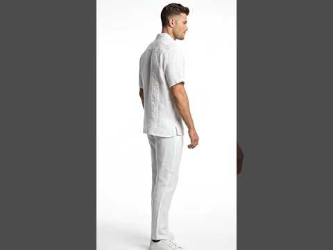 Mens White Embroidered Walking Suit Set – Short Sleeve Shirt and Pants Casual SummerVacation Outfit