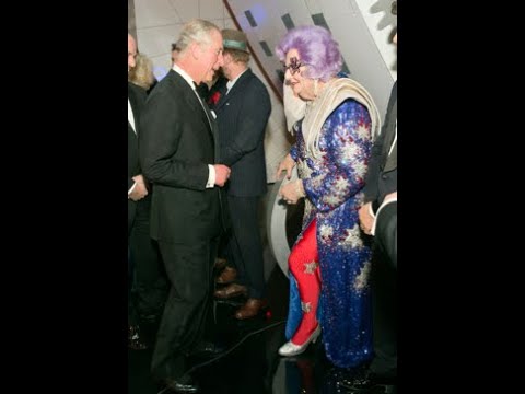Dame Edna greets the Queen Mother, Charles & Lady Diana