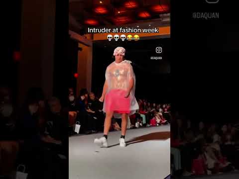 Dude models trashbag at fashion show.