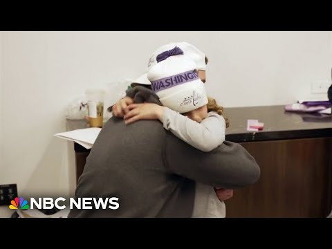 Logan Thompson surprises Sutton, a 7-year-old cancer patient, at bell-ringing ceremony