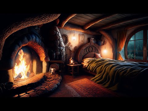 Cozy Hobbit Bedroom - Relaxing Fireplace with Soothing Rainfall Sounds / rain on roof / Deep Sleep