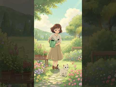 Peaceful Garden Morning with a Girl and Her Cat 🌸🌿