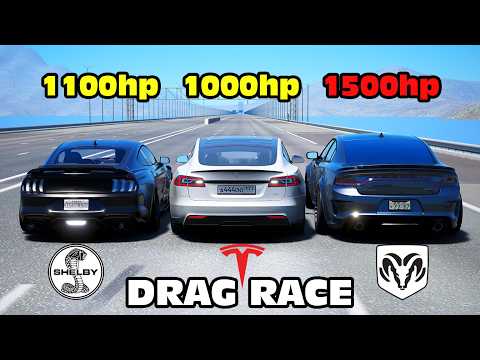 1000HP Tesla Model S Plaid vs Dodge SRT vs Mustang GT500 DRAG RACE