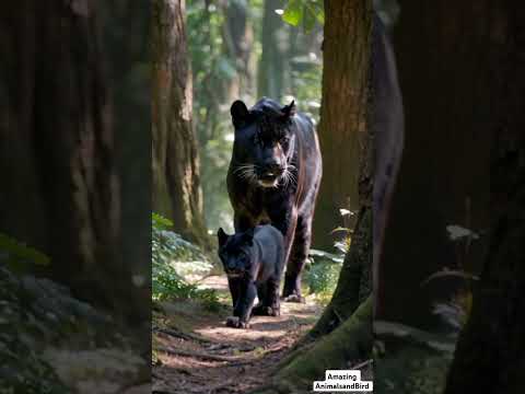 Rare Black Panther Family Stroll: Mother Panther Walks with Two Adorable Cubs in the Wild!