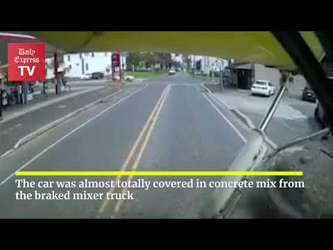 Reckless car gets 'mixed up' by cement mixer truck