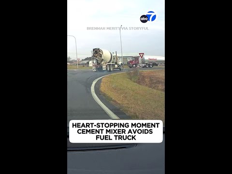 Heart-stopping moment cement mixer avoids fuel truck
