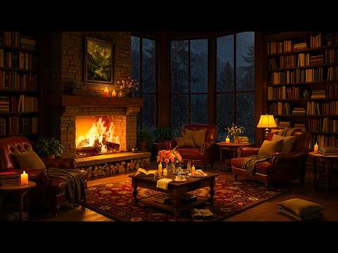 Cozy Reading Nook Ambience 🔥 Soft Jazz with Gentle Night Rain & Fireplace Sounds to Study, Sleep