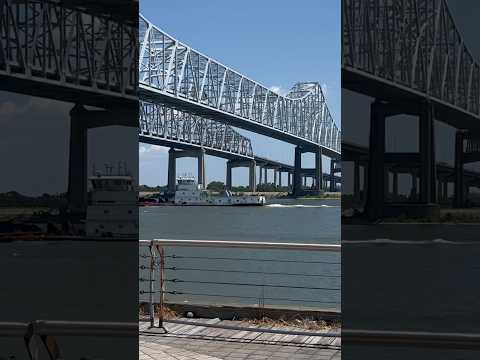 A tugboat sails down Mississippi River in New Orleans under bridges #neworleans #mississippiriver