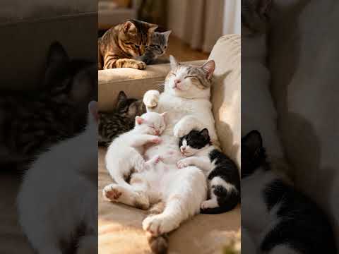 Mama Cat’s Sunbeam Nap with Her Tiny Snugglers 🌞