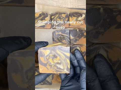 Stamping the newly cut soap. This one is green tea and turmeric with lemon and lime essential oils.